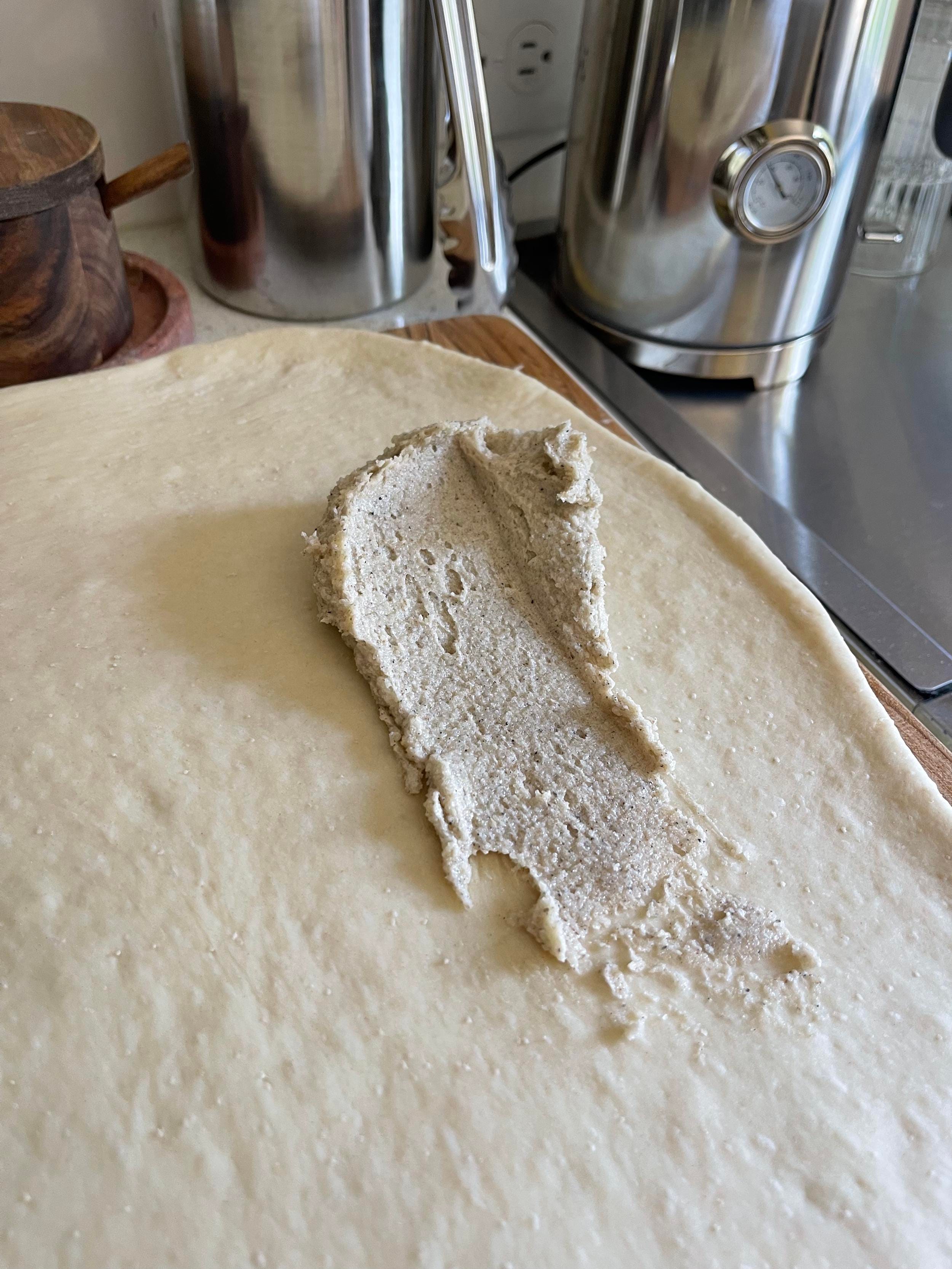 Prepare and flour a large surface (we used a large wooden board). Turn your dough onto this surface and gently begin to roll it out into a flat rectangle. It should deflate on its own. Using a spatula, spread the cardamom butter filling onto one half of the rectangle. We recommend spreading it length wise.