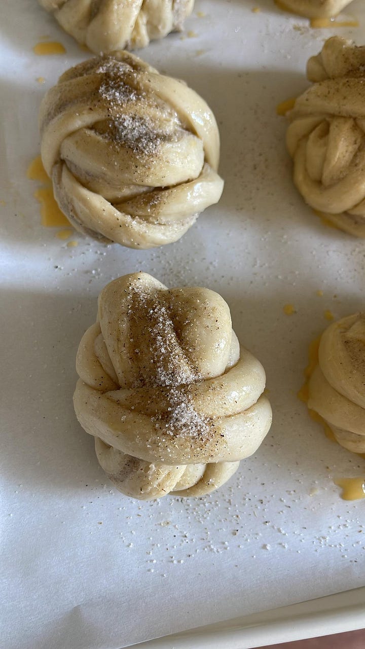 You can then brush each bun with an egg wash and sprinkle with a mix of sugar and ground cardamom.
