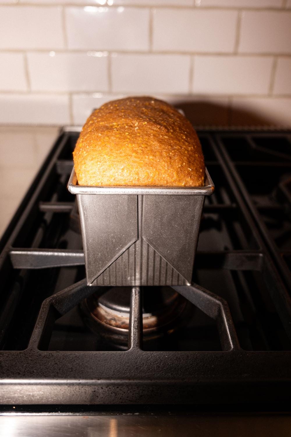 Cover and let rise for 2 hours. Preheat the oven to 350F or 180C, brush the top of the loaf with melted butter and bake for 45 minutes.